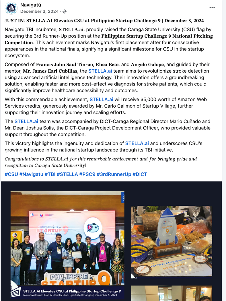 The Caraga State University was recognized as the Best Program Partner-NGA/NGO for commendable support and exemplar contribution to Sustainable Livelihood Program for CY 2024 and received trophy of Kabalikat Award under Public Partner Category as Most Outstanding Partner. This given on 13th day of December 2024 at Doties Place, Butuan City. The event was attended by our Extension Director Dr. Romell A. Seronay together with TTLO/ITSO Chief Charisse D. Galusan.