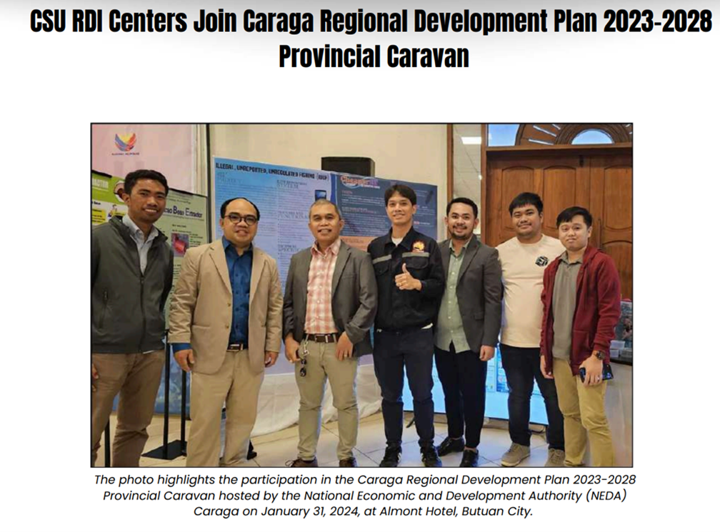 2. Participation in Regional Development Councils: CSU representatives actively participate in regional development councils and committees specifically at the development of the National Economic Development (NEDA) Caraga Region Development Plan (RDP) 2023-2028, contributing expertise and insights to the creation and implementation of the development plans. This involvement ensures that educational perspectives are integrated into regional policies addressing poverty and related socio-economic issues. The NEDA Caraga Region Development Plan (RDP) 2023-2028 aligns with SDG 1: No Poverty through a multi-dimensional approach that tackles the root causes of poverty and fosters sustainable economic empowerment. This plan emphasizes job creation, skill development, and support for MSMEs to stimulate local economies and promote inclusive growth. Investments in agricultural modernization, infrastructure enhancement, and renewable energy aim to improve productivity, food security, and access to markets and essential services. Additionally, comprehensive social protection programs, expanded access to basic services, and disaster resilience initiatives are integrated to safeguard the most vulnerable communities, providing them with the support needed to withstand economic and environmental shocks.