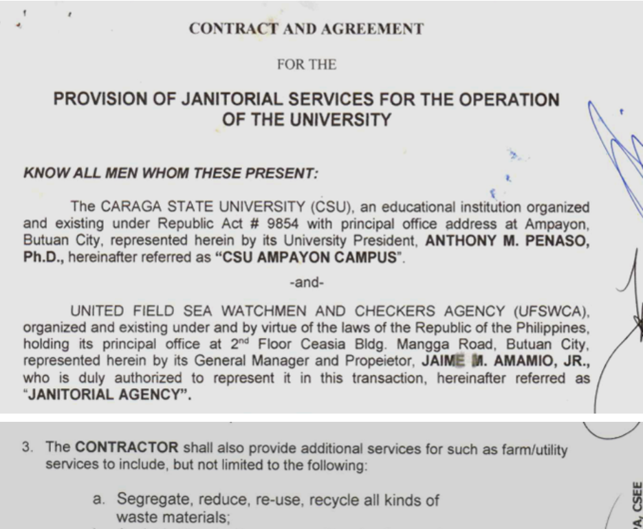 Caraga State University (CSU) has outsourced services for Janitorial and for security services. The university’s commitment to SGD 12 has been part of these contracts, specifically, under agreement item number 3. Below is a section of the Janitorial Services Contract term #3.