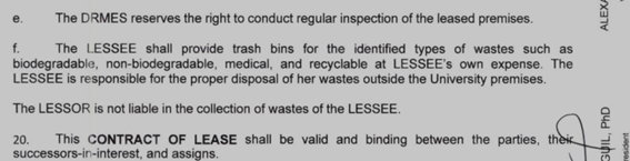 For other wastes generated by business concessioners, CSU explicitly stated in the Contracts a provision that these business partners shall observe proper waste segregation and disposal protocols to align with the LGU-Butuan’s guidelines. Below, is an excerpt from a sample Concessionaire Contract in the year 2023 and 2024 for all food concessioners in the campus.