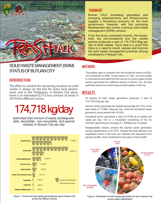In 2019, Caraga State University (CSU), in partnership with the City Government of Butuan published a Policy Brief outlining the Status of the Solid Waste Management of Butuan City.