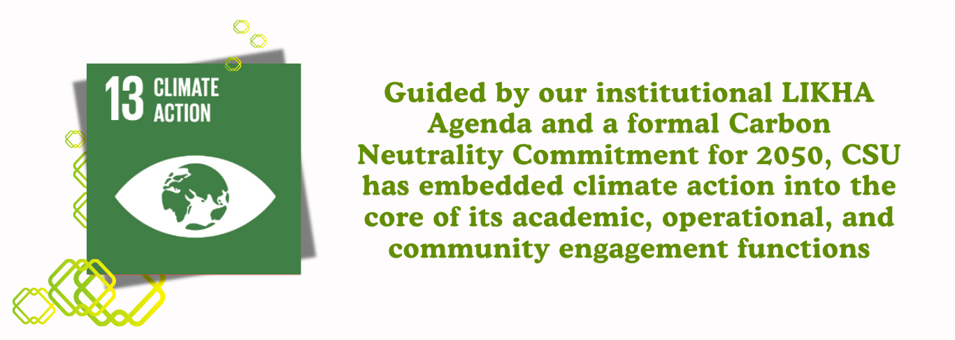 Caraga State University (CSU) presents this report as a testament to its deep and actionable commitment to the United Nations Sustainable Development Goal 13: Climate Action. Guided by our institutional LIKHA Agenda and a formal Carbon Neutrality Commitment for 2050, CSU has embedded climate action into the core of its academic, operational, and community engagement functions.