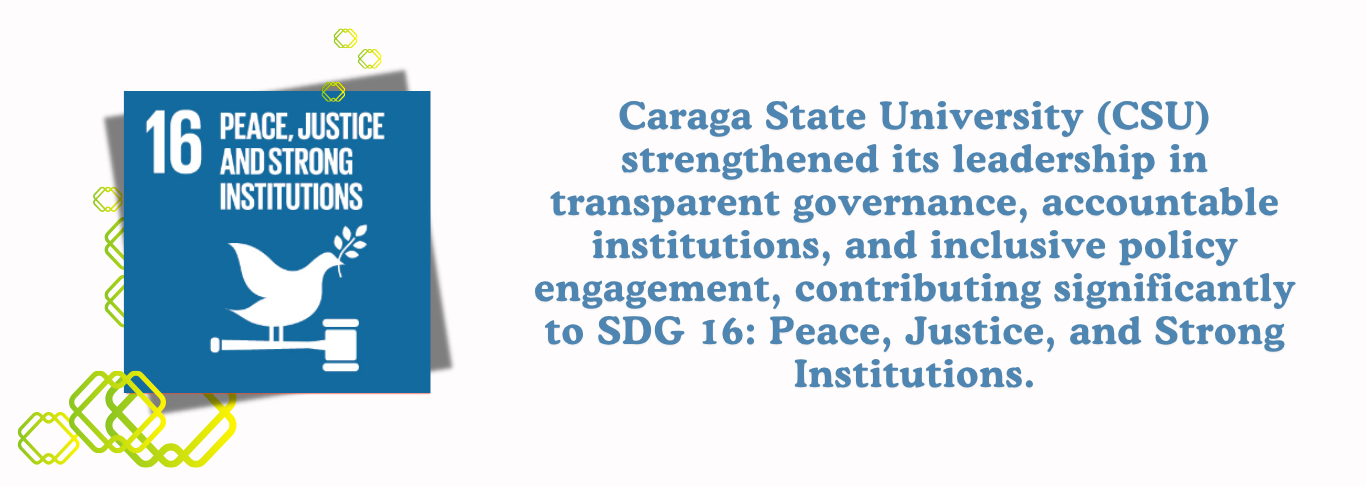 Caraga State University (CSU) strengthened its leadership in transparent governance, accountable institutions, and inclusive policy engagement, contributing significantly to SDG 16: Peace, Justice, and Strong Institutions. Through reforms in procurement, strategic governance initiatives, multi-agency collaborations, and community-based capacity building, CSU demonstrated strong institutional integrity and public-sector accountability.