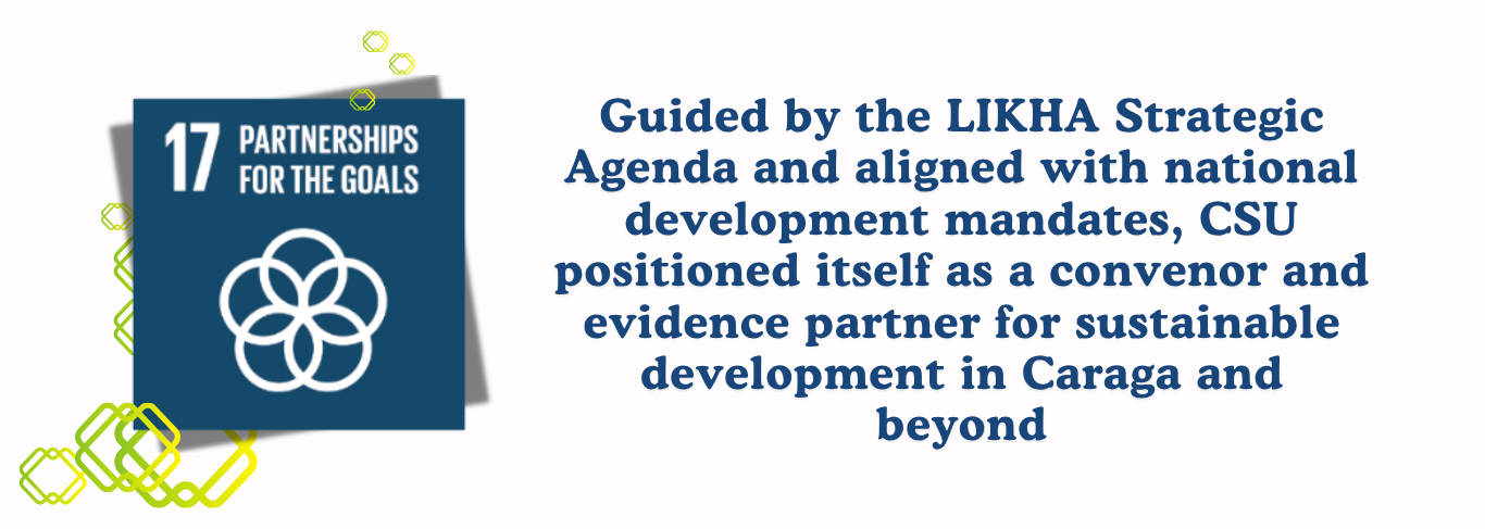 In 2024, Caraga State University (CSU) demonstrated a whole-of-institution commitment to SDG 17 through international research collaboration, multi-sector policy engagement, transparent reporting, and curriculum integration. Guided by the LIKHA Strategic Agenda and aligned with national development mandates, CSU positioned itself as a convenor and evidence partner for sustainable development in Caraga and beyond.